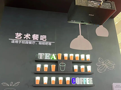 愛普生藝術餐吧方案,采用愛普生激光工程短焦投影機產品,投影將影像投射在3D物體上,形成光影與實物的虛實結合效果,打造出3D Mapping光影餐吧,賦予空間以生命力,打造出校園的趣味空間。