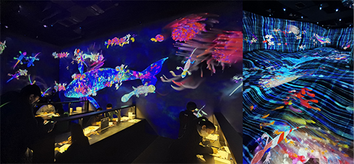 出于對工程投影項(xiàng)目參觀的習(xí)慣,我在拍照時(shí)嘗試找到墻壁接縫處的圖像過渡,確實(shí)不相瞞,在這里我一度數(shù)次撞上了玻璃面而不自知,讓人目不暇接的色彩在鏡面的反射下仿佛無邊無際,根本讓人無暇顧及細(xì)枝末節(jié)之處。不過當(dāng)我找到縫隙接合之處,我也是贊嘆于teamLab在內(nèi)容設(shè)計(jì)上的巧妙,在兩面之間多處運(yùn)用了細(xì)微明暗對比的手法,加上圖像內(nèi)容本身若隱若現(xiàn)的動(dòng)態(tài)展示,萬難以得見圖像在穿越接縫處被拉伸變形,影響觀感的情況。 |