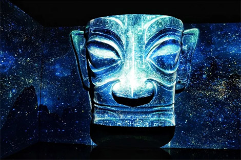 當游客穿行在互動長廊,并觸碰流沙,屏幕將顯露出璀璨奪目的青銅縱目面具與古時銘文,讓人久久逗留于此,全然忘記這僅是首個光影展項。
