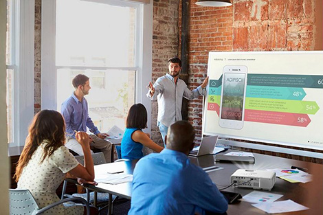 會議演示中,EPSON CB-L210W更能顯示出豐富功能,比如屏幕鏡像功能,通過Miracast可以將智能終端及PC畫面直接投影至屏幕,無需任何連接線即可實現高清信號的傳輸。 其還內置分屏功能,實現同屏雙畫面或四畫面并列顯示,可同時投影遠程參會者視頻影像和電腦上播放的演示材料。