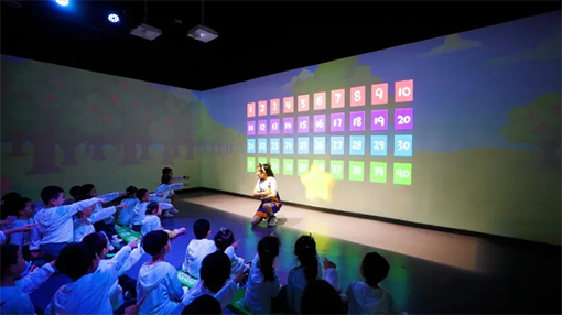 潘德是主角兒童劇場使用了6臺愛普生超短焦投影機,通過融合技術和270°的環繞設計,在有限的空間內,為孩子們打造了一個更好的沉浸效果,賦予了小朋友們交互體驗感,使其真正的融入到整個故事情節里,身臨其境的感受兒童舞臺劇的魅力。