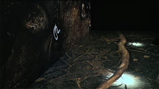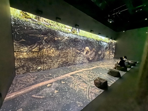 絕佳的視覺效果、有趣的內容創作,距離沉浸似乎還差那么一點,于是……真實場景的補足來了。一根其貌不揚的圓木隨意放置在展覽空間中,當承載內容的光影亮起的一瞬間,熱帶雨林的既視感潮涌般席卷而來。孤掌難鳴,影像、內容、布景的精彩融合令“沉浸”淋漓盡致。