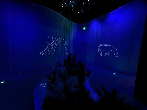 優秀的內容是光影展成功的重中之重,然而觀眾對于內容的“優質”評判標準也在當下火熱泛濫的光影展浪潮中不斷攀升。“地球奇旅”展方在內容創新上付出的心血顯然得到了應有的回報。這個漆黑的空間中,洞穴的奇貌本應被光影“公之于眾”,但此刻我們卻偏是被帶入了“蝙蝠視角”,以回聲波探測的形式逐步窺得洞穴全貌,如此新奇的體驗極大程度提升了游客的觀展興趣,EPSON恰如其分的投影方案體現在實際觀展中,觀眾極高的留存率為展覽贏得了大量口碑好評與親友推薦。