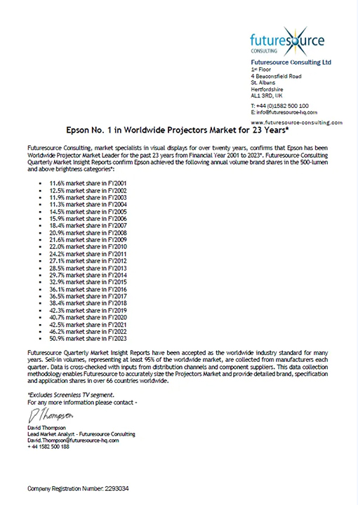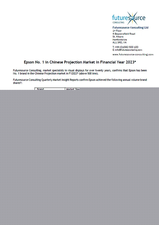 日前,權(quán)威市場研究機構(gòu)Futuresource發(fā)布最新季度市場洞察報告,愛普生再次成為全球及中國市場的焦點--連續(xù)23年蟬聯(lián)全球投影機市場份額榜首*。