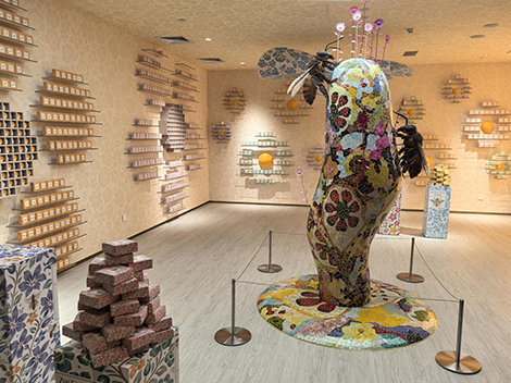 在游客沿著金色蜂巢館的階梯上行的過程中,影像依次呈現了蜜蜂與植物間相互適應與共同進化的微妙關系;蜜蜂戰勝大黃蜂的奇妙策略、口糧分配的智慧、優生優育的選擇;以及族群內分工明確、緊密協作的繁衍模式等豐富的科普內容。