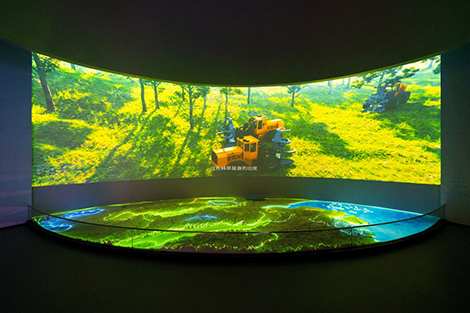 隨著機械制造技術的不斷進步,園林機械技術水平開始向更高層次發展,這一展區利用愛普生投影機結合弧幕投影與 3D地貌 Mapping 技術構建了一個展示林草裝備與生態環境的共生空間。在光影中生動展現中國林草裝備在守護綠水青山、推動生態可持續發展方面的卓越成果。