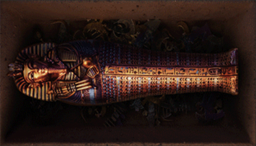 伴隨著壁畫的演繹,空間中心的屏幕中,正在展示著法老的棺槨從木乃伊開始到金面具再到人形棺一層層合起。