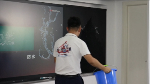 在實際的使用過程中,板書的擦除也成為了教師對互聯黑板這個電子產品的最大擔憂。想用戶所想,鴻合在發布會上用行動說話,直接“暴力的”用裝滿水的水桶潑灑寫有板書之處,全貼合的設計很好地避免了水漬進入顯示面板之后,長期形成氧化的問題。