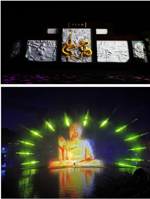 PH3501QL+打造的水幕電影,以水之無形相萬佛之景,光影折射中演繹了佛陀故事。華東第一光影秀的盛裝演繹,讓我們看到了一個開化特色小鎮釋放的文旅產業投資和消費潛力。同時,利用高科技手段打造文化與生態的珠聯璧合,值得其它特色小鎮夜游項目借鑒。