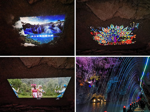 溶洞絕壁上的棧道懸空而掛,酷似一條長長的“火龍”通往路的盡頭,隨后走出支洞卻是別有洞天。原來高達(dá)上百米的溶洞頂部自成方圓,如此平整的頂部石壁簡直是光影特效生動(dòng)呈現(xiàn)的最佳“幕布”。利用2臺(tái)NEC雙色激光投影機(jī)英雄PX2000UL+