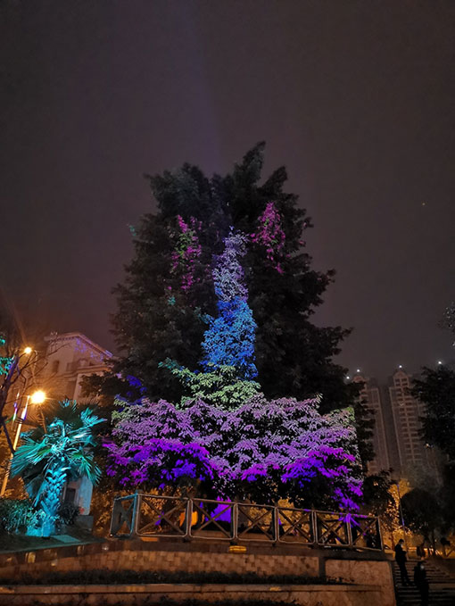 特別是成都金堂的毗河灣旅游度假區(qū)現(xiàn)“樹上投影”奇景,在今年春節(jié)爆紅網絡,吸引了不少市民慕名前來打卡。位于金外灘梯步廣場兩側的參天大樹,樹影搖曳,用2臺NEC