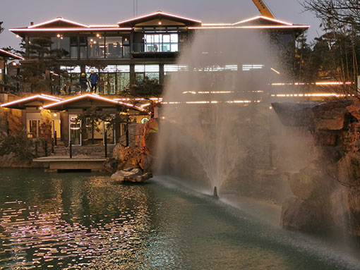 被譽為“沂蒙桃花源、臨沂后花園”的茶芽山,孤峰秀出、茶香四溢。這里不僅擁有深厚的歷史文化底蘊,更孕育了深厚的禪茶文化,如今這片紅色熱土迎來了蝶變。為建設“茶山國家鄉村公園”,茶芽山田園綜合體項目應運而生,結合山、水、林、田、湖生態保護修復工程,打造含田園農業、茶芽文旅、康復醫療、樂活宜居和花果樂園五大板塊,形成地域鮮明的新型田園綜合體。與此同時,10臺NEC哈勃系列激光投影機應用在此,通過流光溢彩的投影秀,在池塘堤岸和水幕上投射出美輪美奐的光影故事,為游客講述著茶芽山的歷史文化和禪茶傳說。