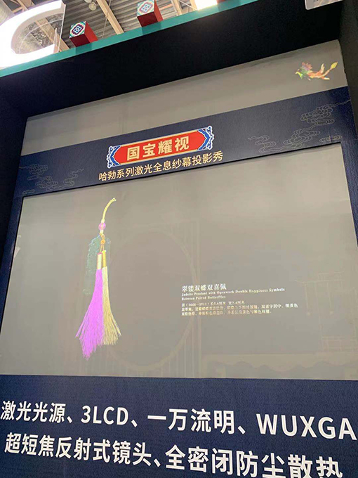 來到NEC展位,喜慶吉祥和盛大美好的氣息迎面而來。由NEC綠洲系列激光投影機(jī)PX1005QL-B+(10000流明、4K分辨率、激光光源)搭配0.37反射式超短焦鏡頭及OPS一體化解決方案打造的“錦繡良辰”展項首先映入眼簾,通過“宮囍龍鳳呈祥”先導(dǎo)片的播放,讓觀眾對中華民族的婚俗文化及清朝皇帝大婚禮儀有一個整體清晰的認(rèn)知。