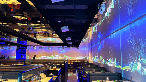 在寬敞空間中打造身臨奇境的沉浸環(huán)境,對于NEC騎士系列來說,可謂輕車熟路。22臺體積小巧的NEC騎士系列CS3300HL有序布局在餐廳頂部,通過畫面融合在3面墻體上投射出巨幅“海洋世界”。多機融合顯示效果最看重的是呈現(xiàn)畫面的色彩一致性,得益于NEC騎士系列內(nèi)置六軸色彩校正功能以及高色域認(rèn)證,餐廳被蔚藍海洋包圍,沉浸、流動感更加鮮活。除此之外,3500流明的高亮度讓投影畫面更加鮮艷靚麗,0.5投射比的短焦鏡頭更讓短距離投射百寸大畫面不在話下。