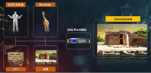 1000影音處理器中,處理器會將課程需要的的背景畫面、PPT簡報、3D畫面甚至AR影像與教師講課的身影融合,呈現出更加的沉浸的教學效果,然后實時將畫面傳遞到學生的屏幕上。
