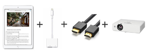 可購買蘋果原裝轉換接頭(Lightning Digital AV Adapter)一端插入iPad接口,一端連接HDMI線,再通過HDMI線連接松下投影機,也能實現iPad畫面同屏傳輸。