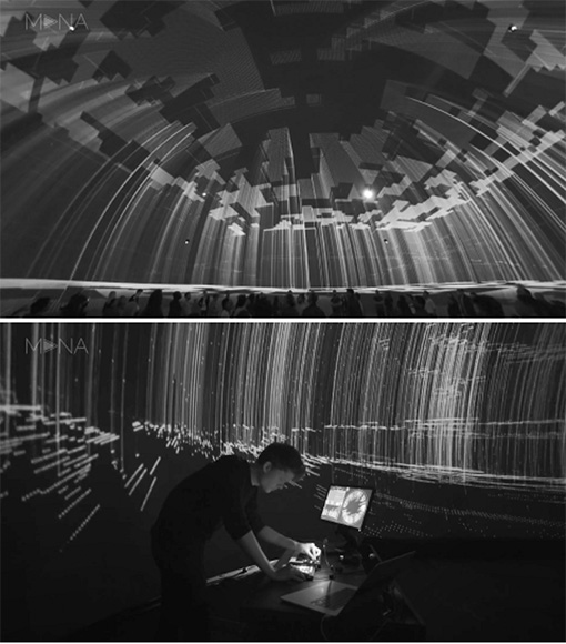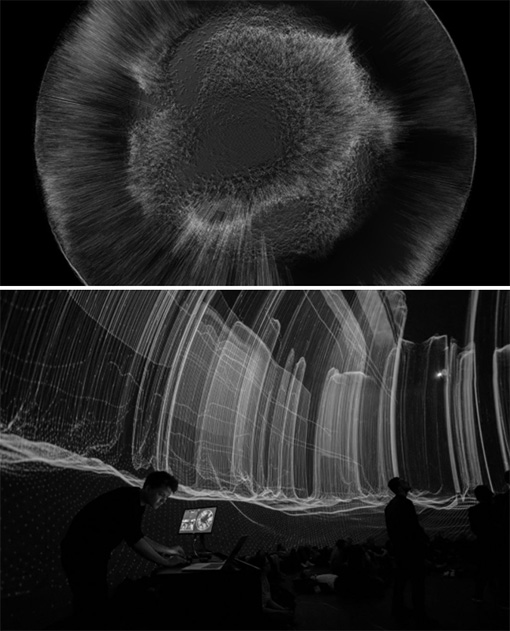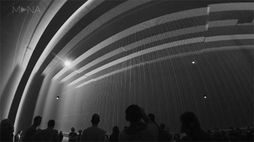 中,細(xì)線編織的虛擬空間圍繞著觀眾。這個脆弱的建筑空間會增長、縮小、坍塌。聲學(xué)維度也是深度空間,緩慢變形的音景漂浮在圓頂周圍,將觀眾包圍在聲音和圖像中。虛擬領(lǐng)域的無所不在被轉(zhuǎn)移到圓頂?shù)奈锢砜臻g中,以揭示經(jīng)常被宣稱的數(shù)字空間的無限性。該作品嘗試研究了穹頂?shù)目臻g效應(yīng),它作為始終圍繞著我們的虛擬網(wǎng)絡(luò)的隱喻。