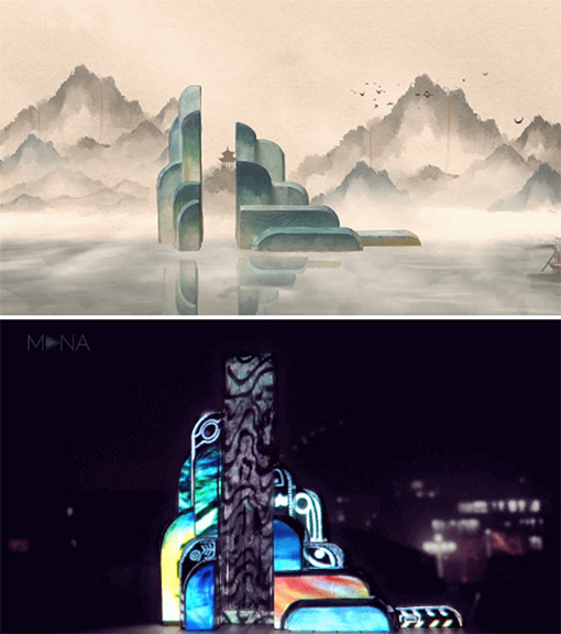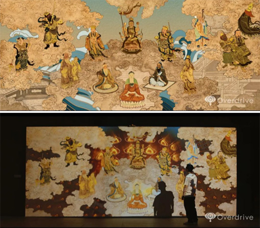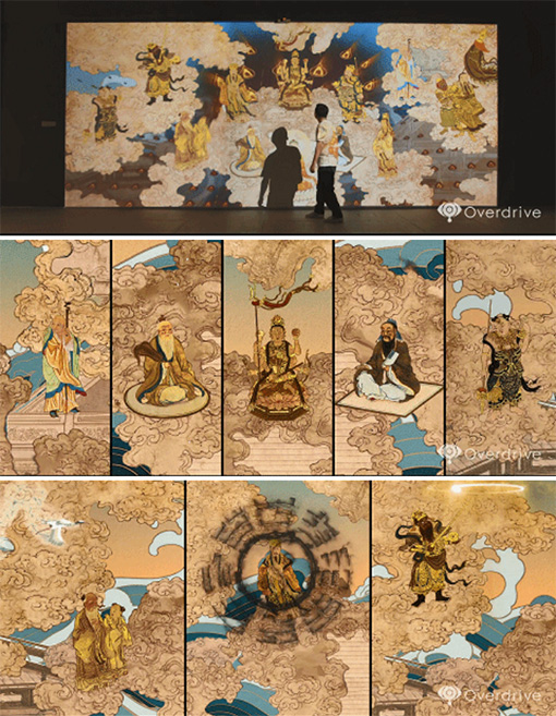 傳統(tǒng)與創(chuàng)新相結(jié)合,用科技美學(xué)展現(xiàn)中國文化。《眾流歸!穼⒅袊宕摹断砩瘛贰ⅰ度合蓤D》、《羅漢祝壽圖》三幅畫作中的人物形象與典故進(jìn)行動態(tài)化創(chuàng)作,解構(gòu)傳統(tǒng)文化元素,融合畫作中道、佛、儒三家,構(gòu)建出和諧而唯美的交互影像空間。原本畫作極富藝術(shù)性與學(xué)術(shù)價值,運用數(shù)字制作與交互技術(shù),又更賦予了娛樂性、新鮮感與科技感。沉浸其中,不知不覺感受到風(fēng)致、雅韻和生動。作品曾在湖南省博物館展出。原畫作來自于長沙市大觀倉藝術(shù)博物館。