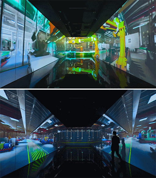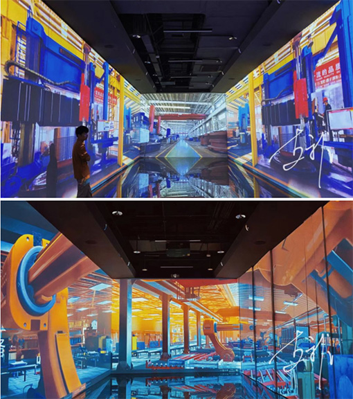 “元.智造工業(yè)沉浸式體驗空間”,結(jié)合投影機(jī)與交互設(shè)備的技術(shù)運用,展示現(xiàn)代工業(yè)的智能生產(chǎn)車間,讓參觀者不用奔赴工業(yè)廠房現(xiàn)場,就能獲得身臨其境,仿佛置身其中。在一個封閉的通道空間,通過投影將空間融為一體,形成一個沉浸式的空間藝術(shù)投影效果,采用感應(yīng)式交互技術(shù),讓墻面的畫面元素與參觀者之間產(chǎn)生互動,觀眾可隨時與廠房內(nèi)設(shè)備交互,查閱需了解的該生產(chǎn)線上相關(guān)產(chǎn)品信息,調(diào)動多感觀體驗。清晰、明亮、生動的優(yōu)質(zhì)畫面,為觀者提供如臨其境的視覺享受,時而宏大、時而震撼的畫面空間,配合產(chǎn)業(yè)車間的同期聲,引導(dǎo)參觀者的情緒,沉浸其中,不覺間,達(dá)到真實與虛擬的高度契合。參觀者穿梭其中,在虛擬場景中領(lǐng)略真實工廠空間的進(jìn)入感受,帶給參觀者不一樣的沉浸式互動體驗。