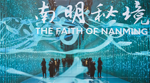 邀請F(tuán)n媒體實驗室以南明河為靈感,創(chuàng)作全新的新媒體交互裝置作品《南明秘境》。此裝置營造了南明河的另一個平行時空,當(dāng)我們步入其中,仿佛進(jìn)入南明河的河體之內(nèi),時間的概念被模糊,從往日的“生態(tài)之城”到今天的“大數(shù)據(jù)之都”,過去、當(dāng)下和未來的圖像在“秘境”中相互交織,我們與這座城市的情感記憶也在其中連接交錯、此起彼伏。視覺上所呈現(xiàn)的道道水紋,由古今題詠南明河與甲秀樓的詩詞經(jīng)數(shù)字化處理形成,歷史詩篇化成水墨,流淌回南明河中,向遠(yuǎn)方涌去。我們在這條“河流”中走過的每一步都將被感知并形成新的圖像,隨著河流向前流淌的方向,我們將共同譜寫貴陽文化的詩篇,攜手走向人與自然和諧共處的美好未來。