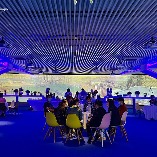 此次博覽會使用了10臺PT-BW550C應用在300多平的咖啡廳中,通過多通道融合技術,不間斷播放帶有京味元素的投影畫面,為現場賓客帶來了震撼的沉浸式體驗。