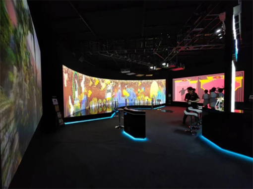 駐足觀看區,石窟壁畫的神秘與華彩在眼前綻開。松下PT-FRQ100C工程投影機的2715x1697分辨率,淋漓還原精致繁復的畫卷。人機交互功能則以手電筒探照石窟的形式在壁畫上呈現,且支持多人同時體驗。