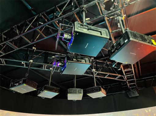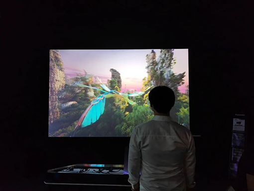 4K投影機,它重量更輕、體積更小,幾乎與松下10,000流明單芯片DLP™投影機相當。在展項中,一臺松下PT-SRQ25KC被輕巧地吊裝在天花板上。該投影機使用全新動態對比度技術,動態對比度達到25,000:1,超高清的4K成像,最終呈現出通透艷麗的畫面。