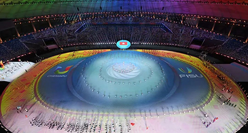大運會開幕式中,投影機擔起地面視覺呈現的大任。在13000余平方米的投影面積中,松下30臺PT-SRQ50KC、30臺PT-SRZ34KC工程投影機參與其中,營造出國際體育賽事熱烈宏大的氛圍。