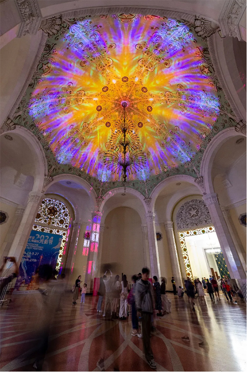 來到上海展覽中心室內,序館“萬光之境”穹頂光影秀,通過穹頂光影氛圍暈染使觀眾進入一個夢幻般的光影世界。變幻莫測的投影在穹頂上呈現出絢爛奪目的光線與色彩,如同流動的光之波浪,將整個空間染上柔和而炫目的光暈。穹頂上的光影如萬花筒般折射、變幻,匯聚成旋渦,吸引著觀眾,仿佛置身于光的海洋。