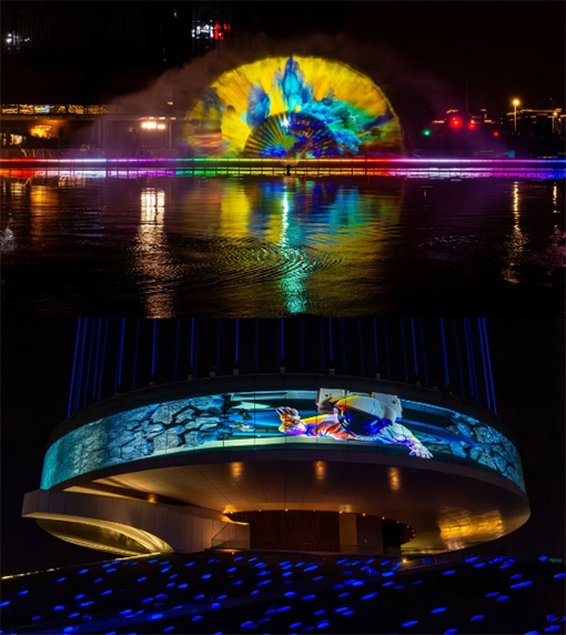 在鄭州如意湖和龍湖上,光影與水共同流動(dòng)出城市的無(wú)限活力,十二道水幕騰空而起,二七塔、大玉米、中原福塔,那些關(guān)于鄭州的印記映在朦朧的水幕上,環(huán)形建筑上,投影精細(xì)勾勒,奉上影像美學(xué)與城市文化的交響曲,人們乘運(yùn)船攬勝,遠(yuǎn)眺近觀皆是美景。
