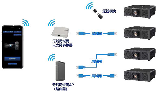 在手機端使用該功能,最多可以對64臺投影機進行電源控制、快門控制、屏幕菜單控制、信號切換、測試模式切換、菜單操作、鏡頭調整、自動聚焦等操作。