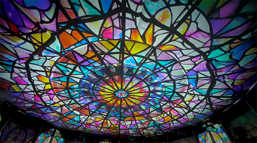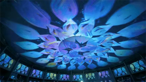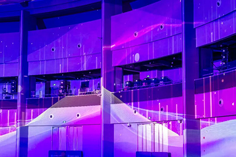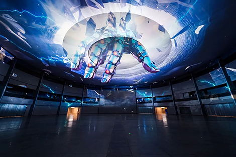 主會場西岸穹頂藝術中心的室內投影分為上下兩個結構,第一部分為頂部巨大穹頂的投影,整個穹頂的直徑約為60米,由18塊結構構成,總面積約3000平方米。第二部分為穹頂下的環幕墻體投影,直徑為60米,周長約190米,高度18.5米,總面積約為3500平方米。