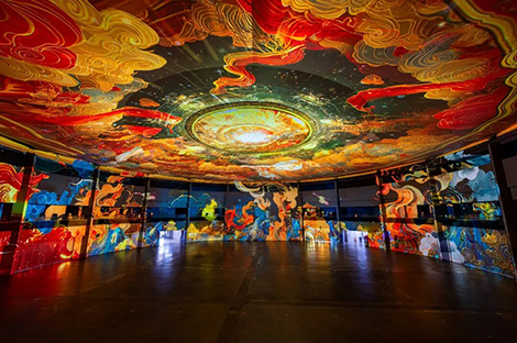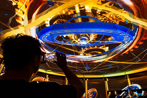 360°沉浸式包裹感的影像鋪滿整個穹頂空間,視線所及皆是流動的光影,觀眾仿佛被吞入一個巨大的全息空間,現實世界的邊界瞬間溶解。觀眾站在穹頂之下,投影從四面八方涌來,人成了漂浮在光影宇宙中的一粒微塵。