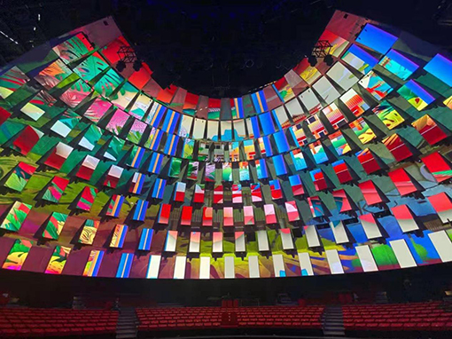 大紗幕由6臺31,000流明的PT-SRZ31KC松下工程投影機雙層疊加,3塊小紗幕則各由2臺21,000流明的PT-SRZ21KC松下工程投影機豎向拼接而成... |