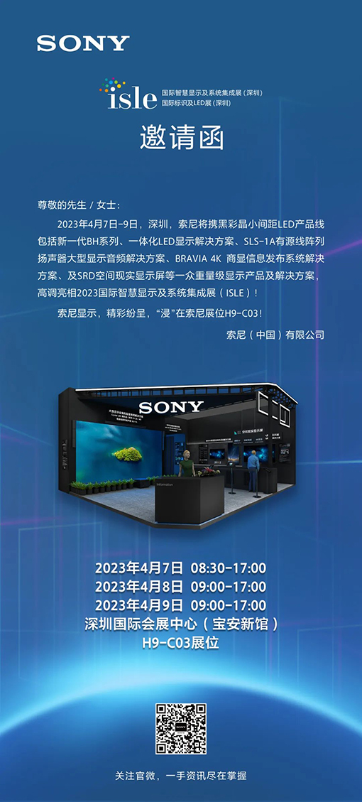 索尼將攜黑·彩晶小間距LED產品線、商顯信息發布系統解決方案等亮相2023國際智慧顯示及系統集成展(ISLE)。