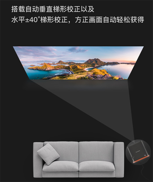 ±40度梯形校正,方正畫面輕松獲得,使得家居擺放更加靈活;內置了智能縮放技術,畫面大小就在指尖,讓用戶不挪動機器,就可調整畫面的大。会槍Σ煌脩舻膽脠鼍埃峁┝巳慰烧{整角度,應對不同用戶的投影環境需求。