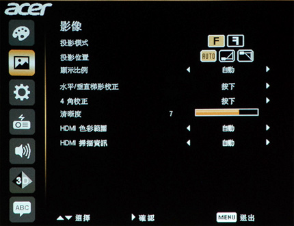 選單第二大項包含投影機架設的修正調整項目,以及清晰度和 HDMI 相關設定為主。