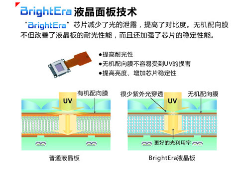 BrightEra液晶面板技術(shù),減少了光的泄露,提高了對(duì)比度。無機(jī)配向膜不僅改善了液晶板的耐光性能,而且還加強(qiáng)了芯片的穩(wěn)定性能。