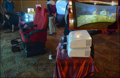 現場的4D影院反響也不錯。它采用4臺亮度為7000流明的高清LX8100工程投影機,配載寬2米,高5米的大型弧形幕+4個偏振片+30個偏振眼鏡+高配置融合圖像處理器+4座一組動感座椅+1個動感精控系統+1張4D動感影片,再配備2.1聲道音效系統,以極其壯觀的高清大畫面積極調動了觀眾的聽覺、觸沉,嗅覺以及其它感知系統,讓人仿佛真正進入了影片中的世界。