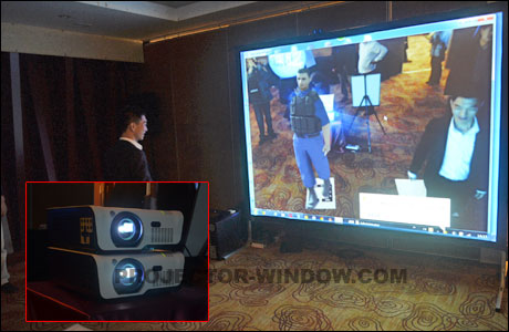“雙機亮亮疊加+增強現實”方案采用用2臺4500流明雅圖全功能工程影機進行高亮疊加,在1臺電腦+1條VGA線的配合下,兩臺高亮投影機以串聯的形式,利用投影機自身的四角校正功能把畫面完美的疊合在一起,從而投射出120英寸高亮大畫面。另外,該方案還搭載二維碼識別技術及體感交互技術+大屏展示系統,通過掃描已編好的二維碼,讓大屏幕上立即三維立體影像。