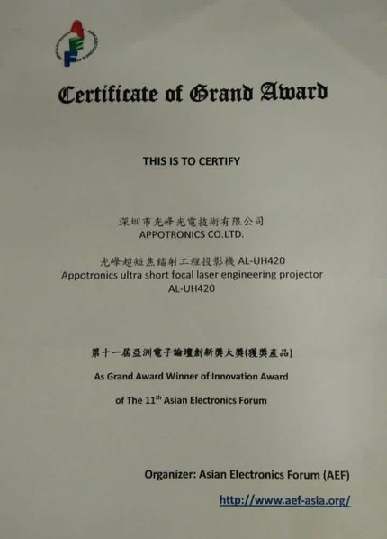 光峰光電超短焦激光投影機AL-UH420獲獎證書