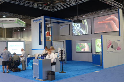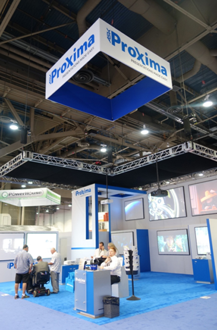 ASK Proxima展館外觀簡約大方、讓產品淋漓呈現,一目了然!藍白相間的主色調融合現場影音結合的舒雅氛圍,彰顯出ASK
