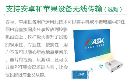 無線功能已成為了當(dāng)下投影機的必備功能,C4系列同樣也支持無線功能。用戶可以通過無線連接,將智能手機或平板電腦中的任何內(nèi)容直接同步分享投放到投影機畫面上,其支持安卓和IOS設(shè)備。這將極大提升投影的娛樂性、專業(yè)性、便攜性,用戶不僅可以隨心所欲的享受音樂、圖片和視頻、玩游戲,而且還可以分享PPT等會議培訓(xùn)內(nèi)容,讓會議投影變得既專業(yè)又從容。