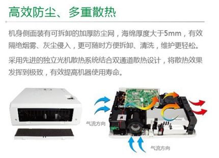 C4商教投影機新品機身側(cè)面裝有可拆卸的加厚防塵網(wǎng),海綿厚度大于5mm,有效隔絕煙霧、灰塵侵入,更可隨時拆卸、清洗,維護(hù)更輕松。同時,再加上采用先進(jìn)的獨立光機散熱系統(tǒng)結(jié)合雙通道散熱設(shè)計,將散熱效果發(fā)揮到極致,有效提高機器使用壽命。