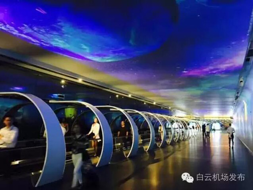 廣州白云機場航站樓的“時空隧道”成為廣州人的傲嬌新名片,凡到過此處的人,無不徜徉于其如夢如幻般的場景而流連忘返,這堪稱繼云山疊翠,珠江水韻,越秀新暉,天河飄絹,古祠留芳,黃花皓月,五環晨曦,蓮峰觀海之后的羊城第九景。媒體是這么描述這條夢幻時空長廊的:“這條借助新科技打造的“動靜結合、人景結合、虛實結合”炫酷時空長廊,集公共服務、藝術展示、廣告發布于一體,是白云機場首推的融媒體模式大型藝術體驗新空間,在全國機場尚屬首創。“時空隧道”全長200多米,空間面積超過2500平方米,位于航站樓主樓負一層西側通道,是旅客下飛機通往地鐵的必經之路。全程突出“云+”的概念,分為“云之家”、“云之夢”、“云之心”、“云之城”四個空間,整體以“云”為設計主元素,既與“白云機場”的“云”相呼應,又寓意飛機穿越云端,與未來“云時代”對話。