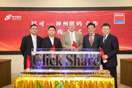 2013年4月16日,神州數碼與巴可公司合作簽約儀式在神州數碼大廈成功召開。神州數碼成為“Clickshare可立享”產品在中國大陸地區的優先經銷商及巴可中國金牌合作伙伴。神州數碼控股副總裁、系統技術集團總經理葉海強先生,系統技術集團視訊事業部總經理彭威先生與巴可全球高級副總裁、全球首席營銷官Jacques