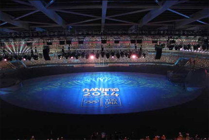 本屆青奧會是北京奧運會后中國舉辦的又一項大型綜合性賽事。2008年北京奧運會開幕式上最讓人記憶猶新的,當屬那個可伸展、可移動的卷軸舞臺。受到當時顯示技術的限制,畫面的大小僅占全部場地的1/3,而本次青奧會開幕式的一大技術看點,便是利用高科技視頻投影技術,讓整個奧體場館地面化身巨大的投影屏幕。青奧會開閉幕式燈光、視頻總設計沙曉嵐介紹,此次地面投影投入112臺巴可高亮度投影機,這在全世界都是規模最大的。
