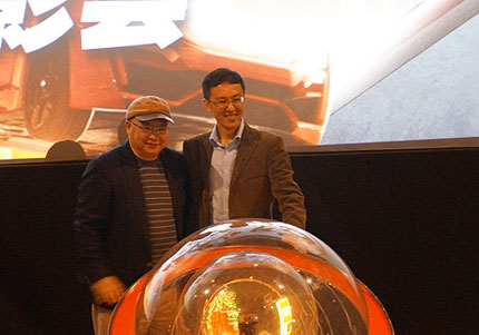 巴可數字電影放映機業務負責人與盧米埃北京芳草地影城領導為新品揭幕