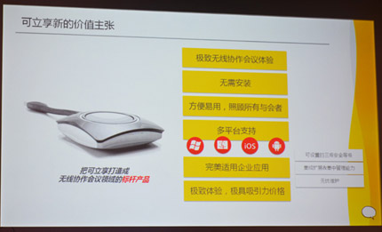 用戶通過可立享的無線演示系統(tǒng),可以直接在演示屏幕上分享筆記本電腦或移動(dòng)設(shè)備上的內(nèi)容。CS-100和CSE-200產(chǎn)品在CSC-1的基礎(chǔ)上進(jìn)行了優(yōu)化升級,增強(qiáng)了中小型會(huì)議室智能會(huì)議系統(tǒng)的便捷性。它無需額外線纜、無需其他設(shè)備、無需等待,與會(huì)人員可直接加入。可立享改變了傳統(tǒng)會(huì)議單一的模式,可允許多人進(jìn)行協(xié)同作業(yè),降低會(huì)議時(shí)間,提高會(huì)議效率,為企業(yè)節(jié)約時(shí)間成本。