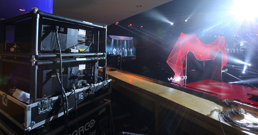 要完成這種大型異型介質投影,其要求不僅在于不同色塊分別呈現不同的艷麗色彩,還需要通過影像追蹤大大加強異型結構的立體感。在UDX-4K32的配合下,異型結構隨著節目及音樂的節奏變換出不同的色彩,令人印象深刻。